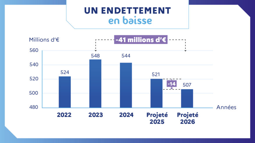 507 M€ d’emprunts prévus au 31 décembre 2026, soit une baisse de 14 millions d’euros en un an et près de 41M€ depuis 2023.