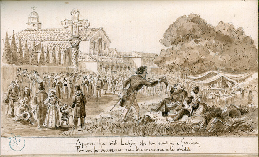 Au Festin de Cimiez, Nem trinque avec Lubin, par Antoine Trachel, encre et lavis d’encre à la sépia, illustration originale pour La Nemaïda de Rosalinde Rancher, Nice, 1823 (Bibliothèque de Cessole).