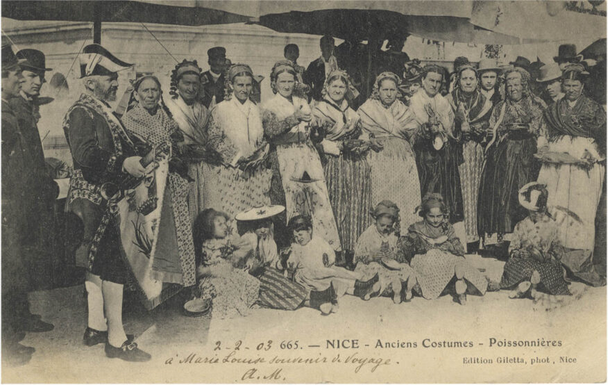Jusqu’au XIX e siècle, les voyageurs de passage à Nice, les artistes qui croquent des scènes sur le vif, remarquent la spécificité mais aussi la diversité des costumes niçois (gens de la terre, gens de la mer, etc.). Le costume est un marqueur social mais surtout, pour les travailleurs, une tenue adaptée au climat et à l’activité professionnelle. Quant aux nobles et aux bourgeois(es), ils sont, comme ailleurs, habillés « à la parisienne ».
